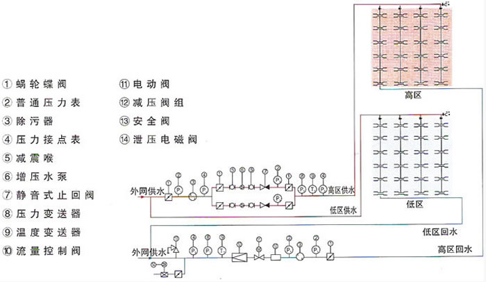 多次試驗(yàn)和大量實(shí)際工程運(yùn)行證明,上述減壓方式安全、有效,運(yùn)行平衡、可靠。加之配備微機(jī)變頻調(diào)控加壓泵,視網(wǎng)上壓力變化情形自動(dòng)調(diào)節(jié)流量、壓力,并輔之于壓力監(jiān)視、超壓告警、水泵自啟動(dòng)、自關(guān)斷、緩關(guān)閉等功能,這樣,一個(gè)完備的高、低樓(區(qū))直接連供暖系統(tǒng)就形成了。
